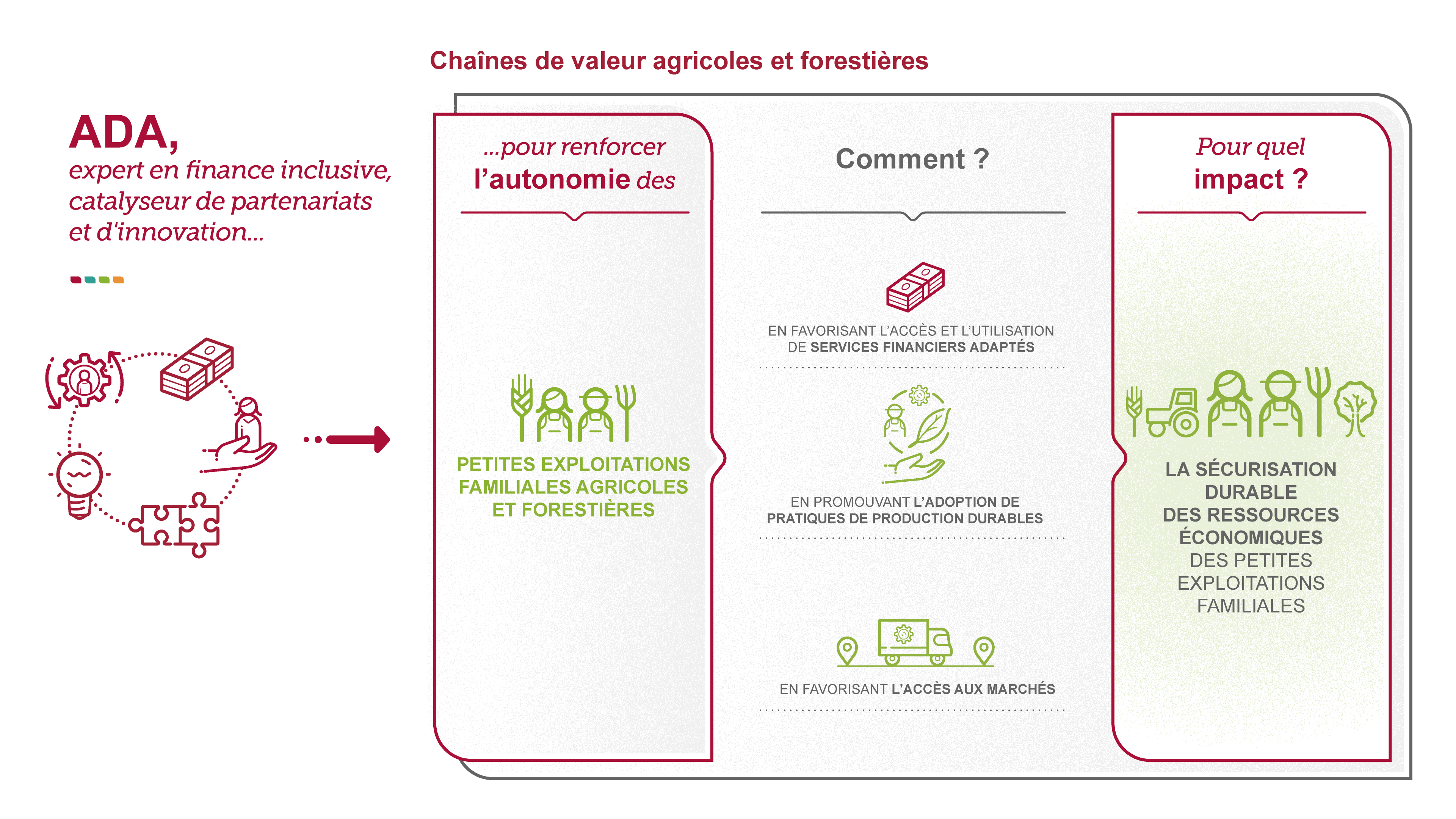 ADA se concentre le renforcement des chaînes de valeur agricoles et forestières, sur le soutien aux jeunes entrepreneurs et l'accès des ménages vulnérables aux services de base.