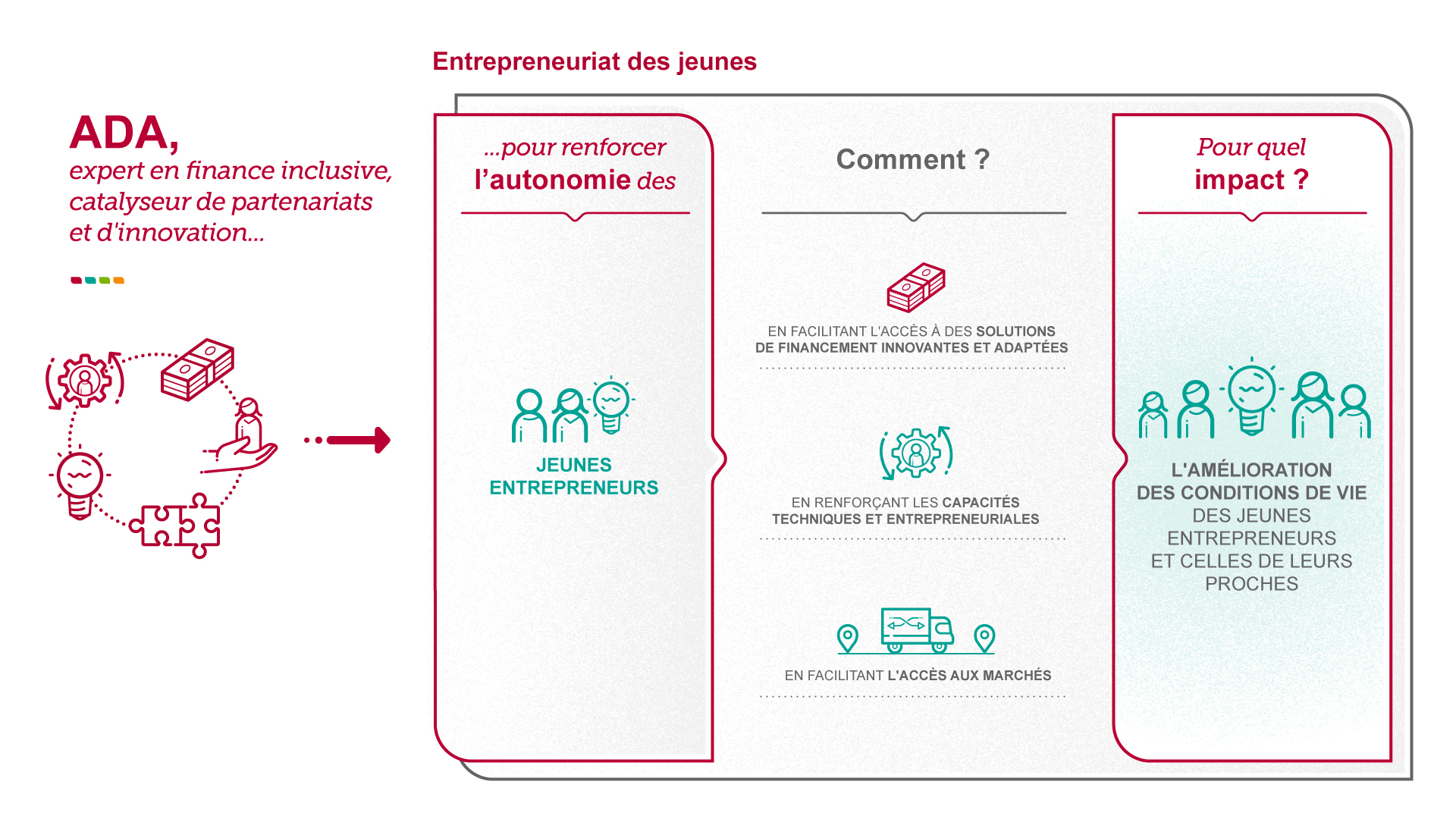 Pour favoriser l’entrepreneuriat des jeunes, ADA les aide à surmonter plusieurs obstacles, en particulier : l’accès limité au financement, le manque de compétences et d’outils de gestion et les contraintes d’accès aux marchés via le développement de solutions de financement adaptées et le renforcement des capacités.