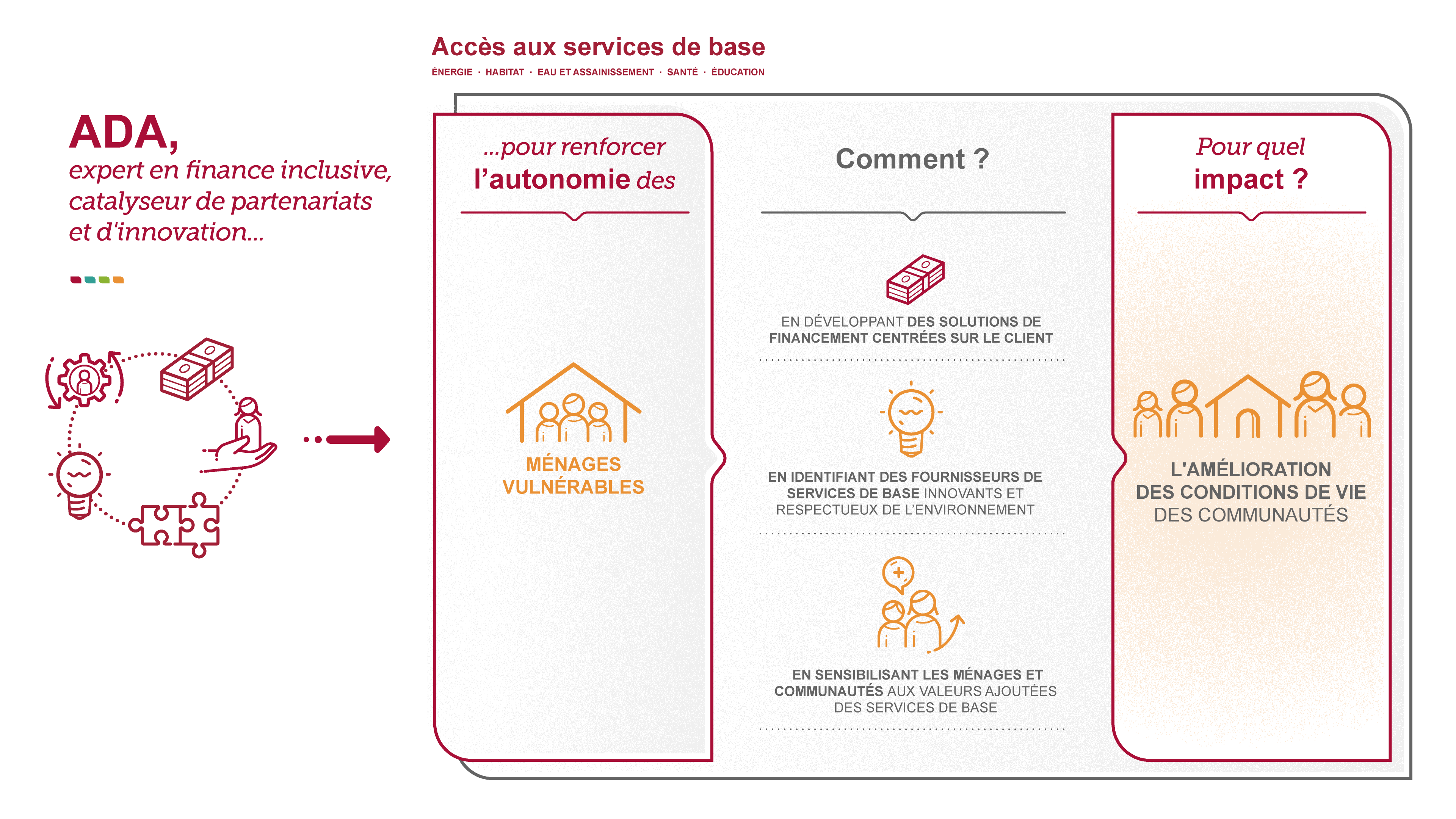 Pour renforcer l’autonomie des ménages vulnérables, notamment ceux qui ont un accès limité aux services de base tels que l’eau et l’énergie, ADA combine des actions d’identification de partenaires spécialisés dans l’accès aux services de base avec des activités de sensibilisation, tout en développant des solutions de financement adaptées et personnalisées.