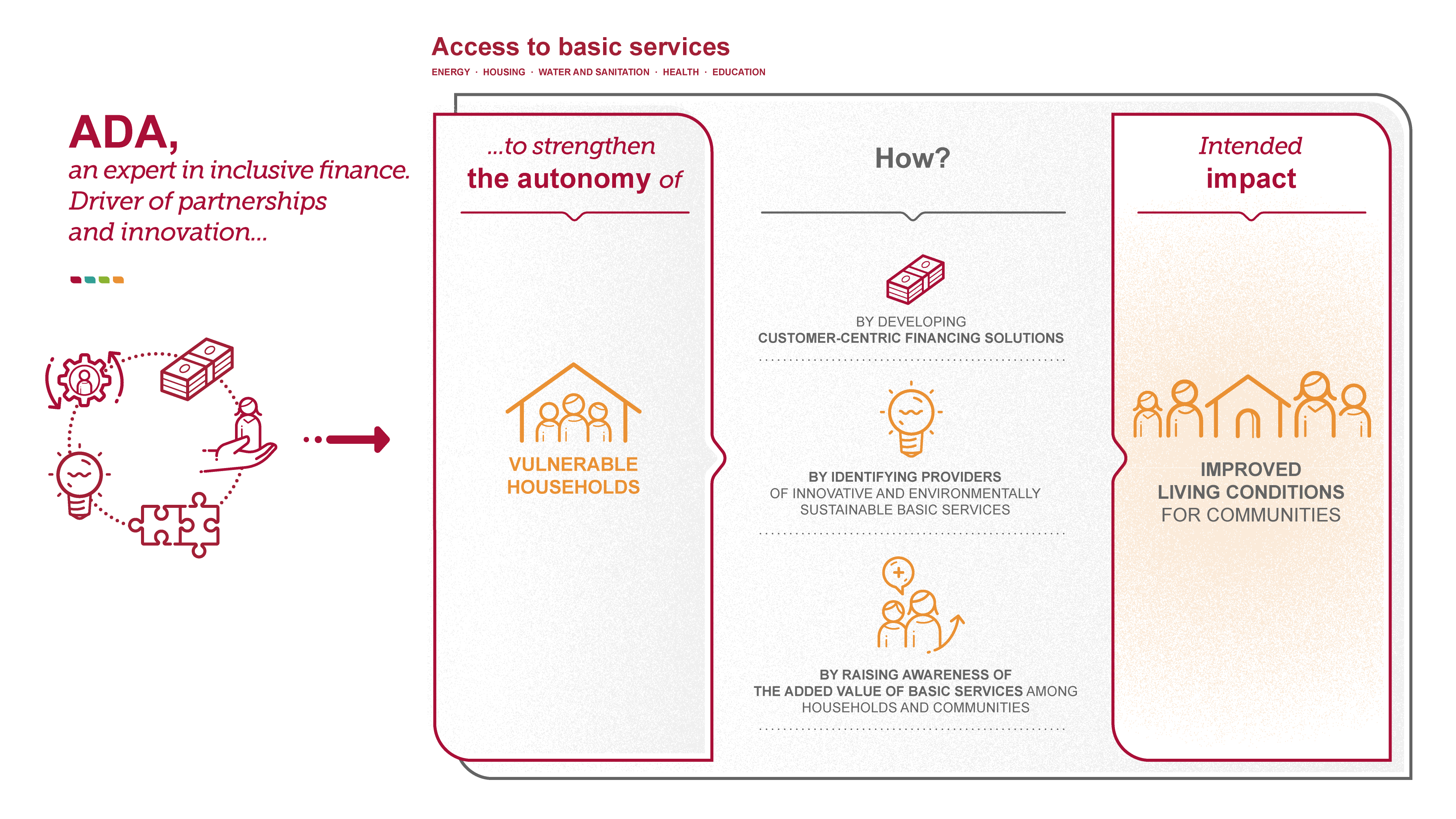 ADA aims to make vulnerable households more autonomous, especially those with limited access to basic services such as water and energy. To this end, ADA identifies specialised partners for the provision of access to basic services and carries out awareness-raising activities, whilst at the same time developing appropriate and tailored financing solutions.