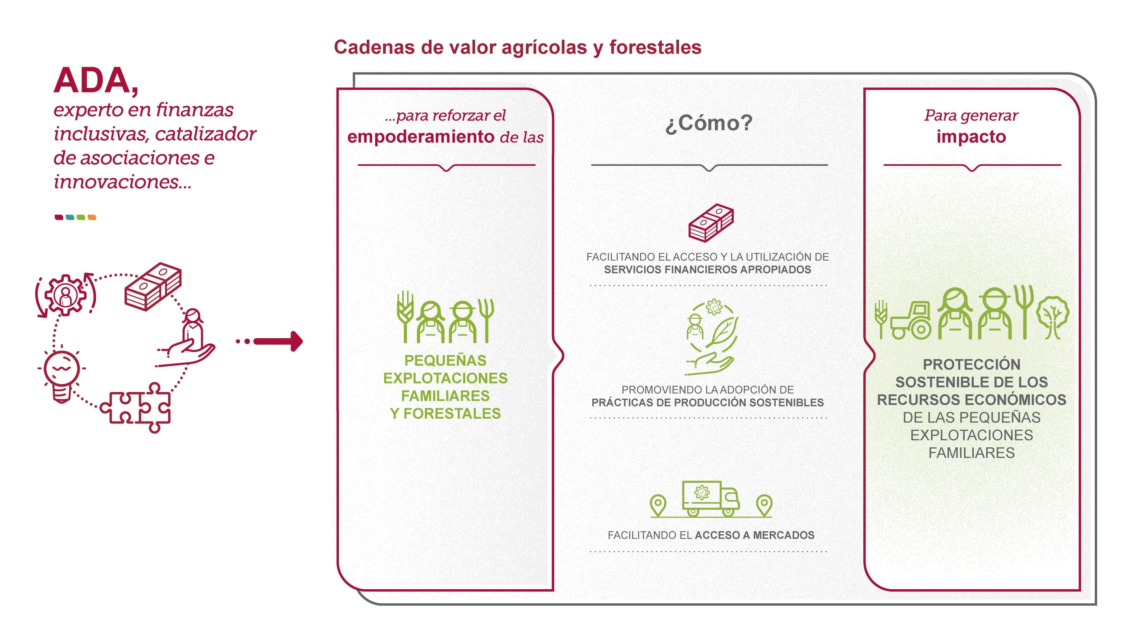 Para proteger de manera sostenible los recursos económicos de las pequeñas explotaciones familiares, ADA implementa acciones que combinen un financiamiento adaptado, con el reforzamiento de las capacidades de los productores, tanto en lo técnico como en lo gerencial, y el acceso a insumos de calidad y a mercados.