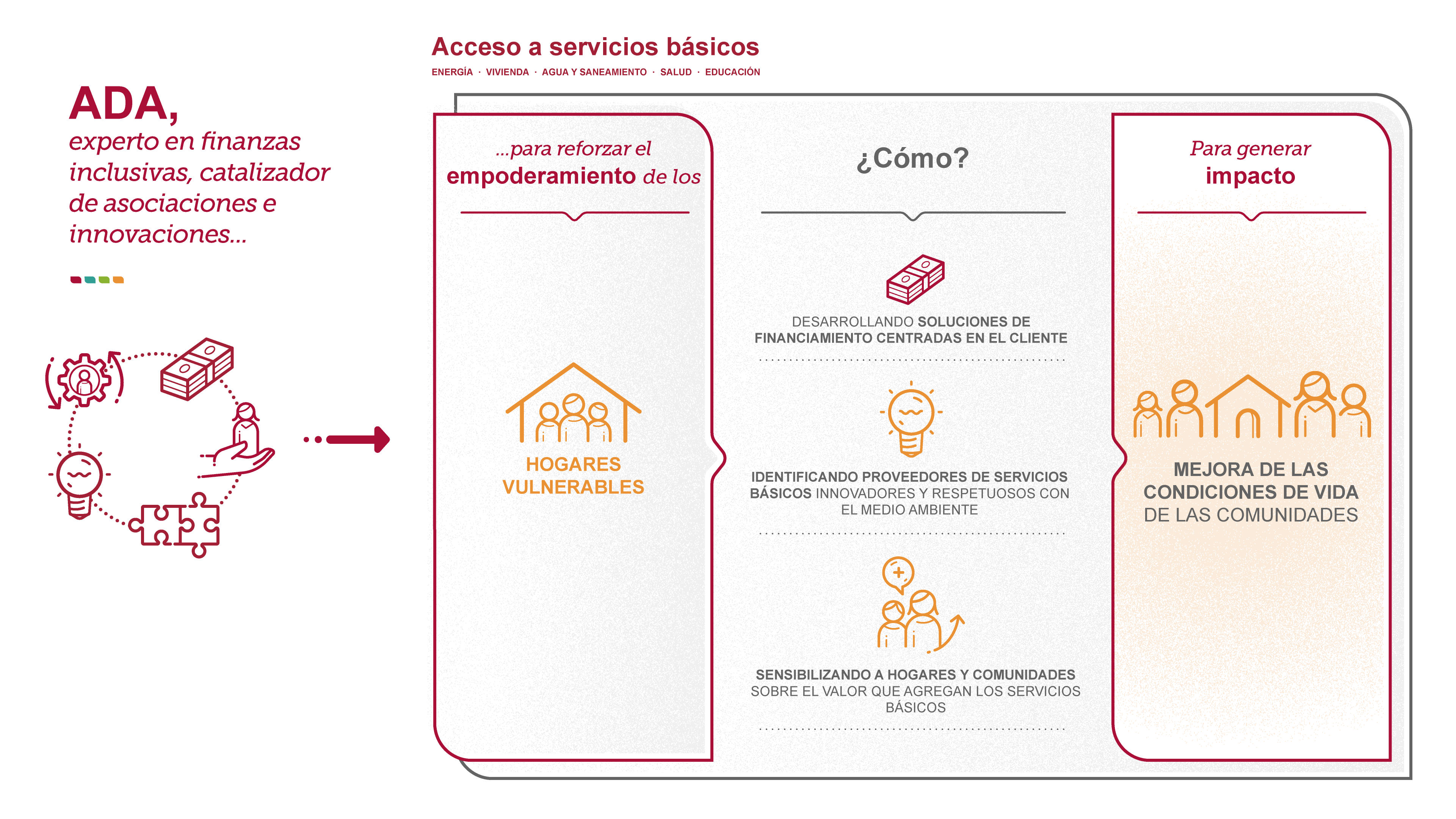 - desarrollar soluciones de financiamiento adaptadas para facilitar el acceso de los hogares vulnerables a servicios básicos que les permitan satisfacer sus necesidades esenciales y crear oportunidades económicas.