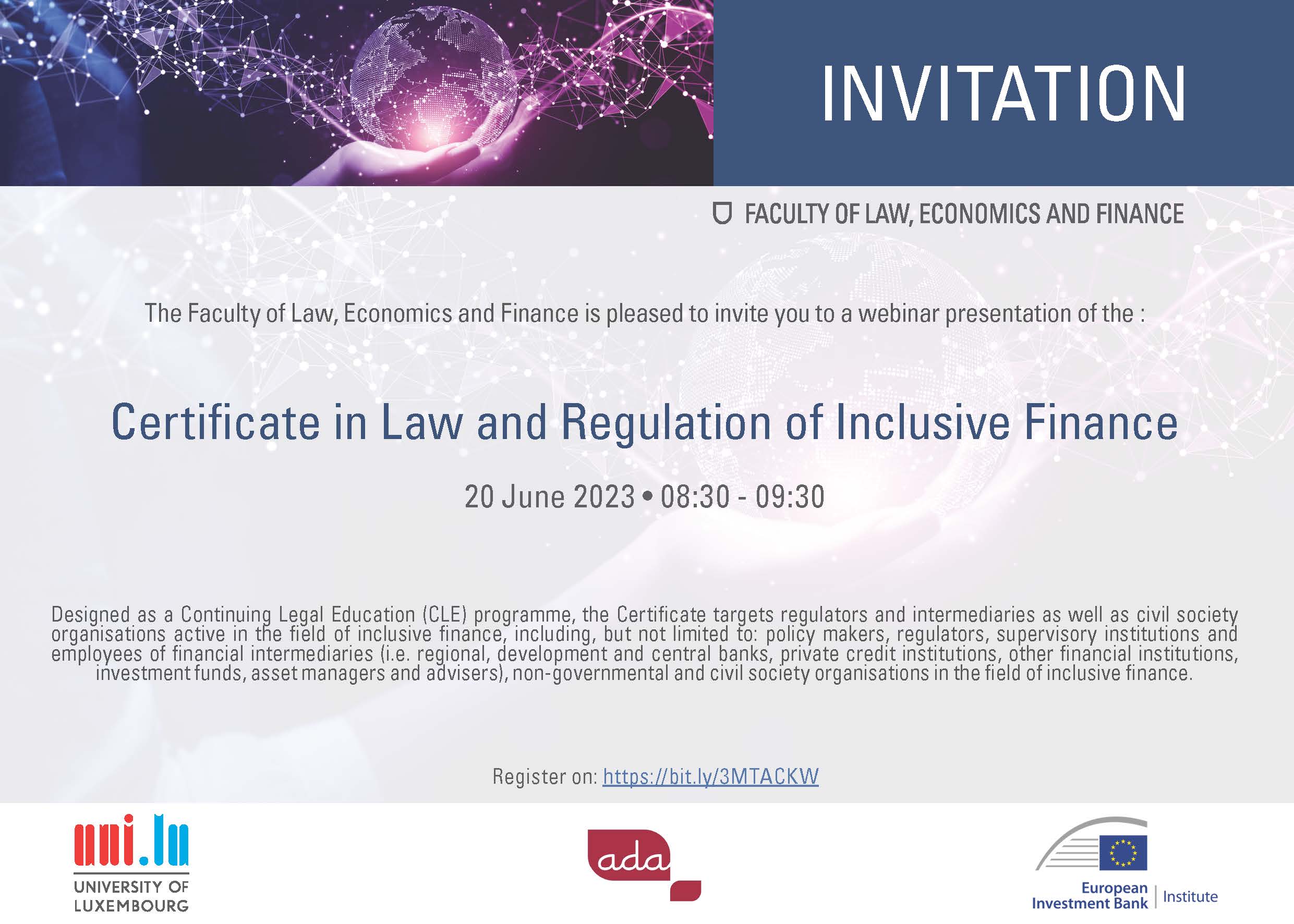 Exceptionnellement, un webinaire sera organisé en ligne, ouvert à tous les intéressés, afin de présenter le certificat, les modalités d’inscription et répondre à toutes vos questions. Les participants assisteront également à une courte présentation sur la finance verte et inclusive par le professeur Dirk Zetzsche, titulaire de la chaire ADA en droit de la finance inclusive et professeur de droit à la Faculté de Droit, d'Économie et de Finance (FDEF).